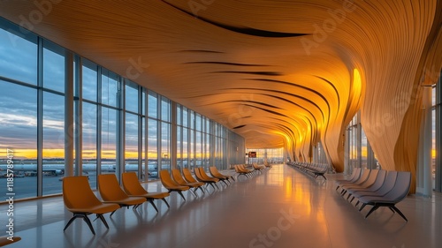 Expansive airport terminal waiting area bathed in the warm glow of a beautiful sunrise.