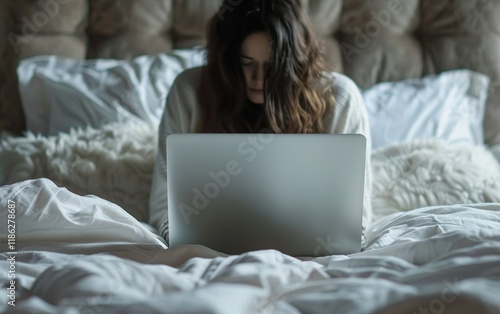 Young woman working on laptop lying in bed. Good enough, low expectations concept. Acceptable, sufficient, average, satisfactory, decent, fair, minimal, mediocre, ordinary lifestyle