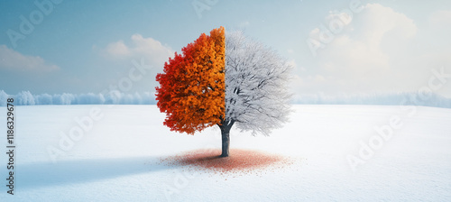 Seasons Divided: A solitary tree stands in a snowy field, half adorned in vibrant autumn leaves, half covered in winter's frost. A captivating image representing the transition between seasons.