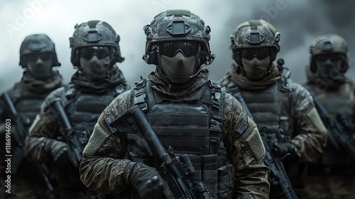 Armed soldiers in tactical gear and helmets stand in formation, smoke in background.