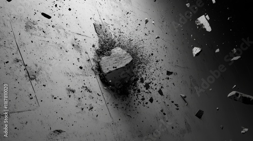 Concrete wall breach, explosive fragmentation effect, detailed debris scatter, dark void center, dynamic destruction scene, realistic material disintegration, grayscale particle spread