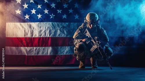 American soldier kneeling with a rifle intense studio lights highlighting their gear with a large gently rippling national flag as the backdrop