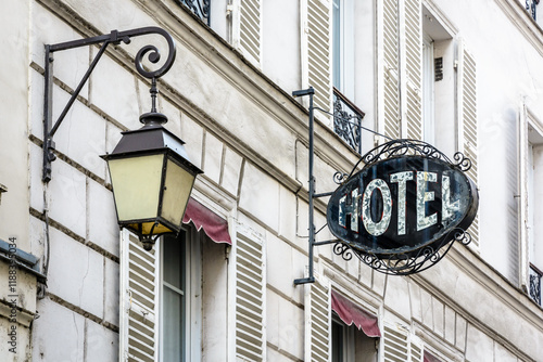 The worn period sign of a modest hotel, made of wrought iron and glass, fixed perpendicularly to the facade of an old building next to a vintage street light in a touristic district of Paris, France.