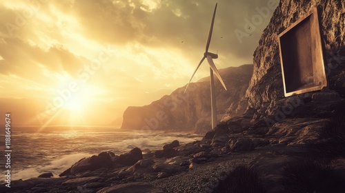 Surreal Landscape featuring a Wind Turbine, a Floating Frame, and a Stunning Sunset Over a Rocky Shoreline with a Dramatic Sky and Gentle Waves