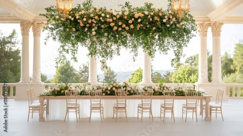 Elegant Wedding Reception Setup with Floral Arrangements and Scenic Backdrop Under Natural Light in a Beautiful Outdoor Venue