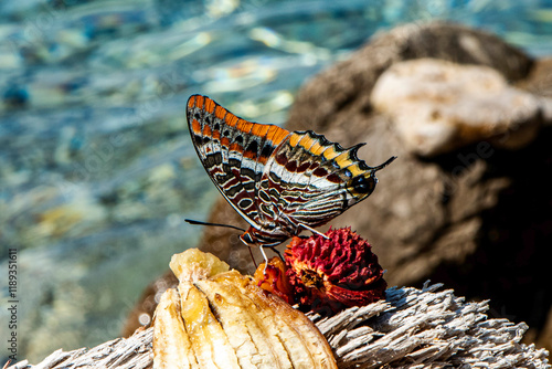 Makrofotografia motyla cesarskiego (Charaxes jasius) w śródziemnomorskim otoczeniu na Sardynii, podkreślająca piękno kolorów i wzorów skrzydeł w harmonii z naturalnym środowiskiem