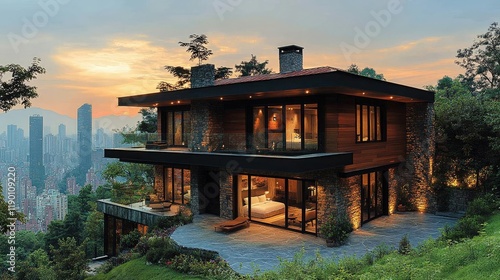 Luxury Modern House on Hillside with Stunning City Sunset View
