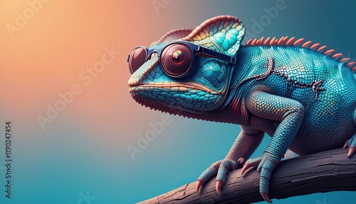 Cool chameleon wearing stylish sunglasses, posing against a vivid and colorful backdrop