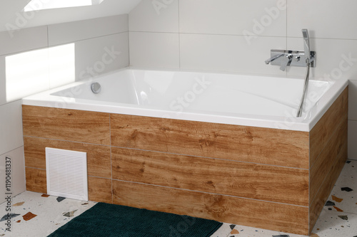 Duża wygodna akrylowa wanna w nowoczesnej łazience, wykończenie i aranżacja wnętrz, projekt luksusowej łazienki