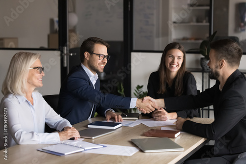 Two business parties shaking hands greeting each other start negotiations in board room, express mutual respect, thanking for cooperation, successful teamwork, establish partnership in company office