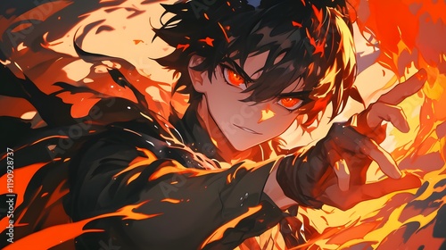 A dark-haired anime man with red eyes, surrounded by flames, exuding an aura of mystery and power