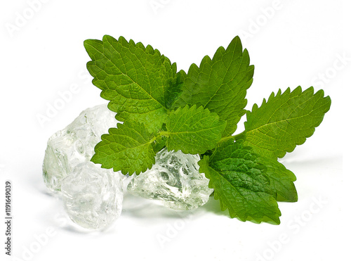 Liście mięty z kostkami lodu na białym tle
