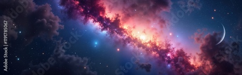 Colorful cosmic scene shows vibrant nebulae, stardust. Milky way galaxy shines with countless stars. Night sky with crescent moon. Cosmic clouds swirl with hues of pink, blue. Vast universe displays