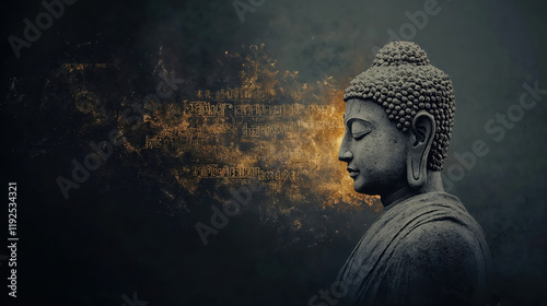 Buddha statue meditating with ancient sanskrit writings appearing on dark background