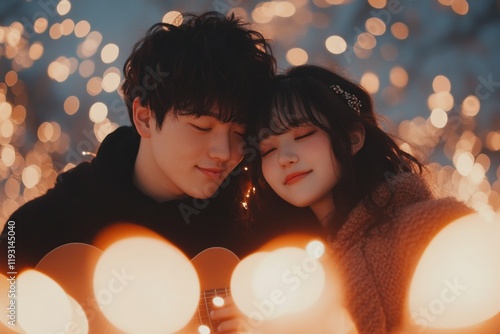 A man serenading his partner with a guitar in a candlelit room, surrounded by soft glowing lights