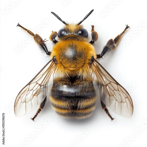 A detailed close-up of a bee showcasing its vibrant black and yellow body, highlighting its intricate features and natural beauty in the environment.