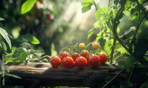 A cluster of cherry tomatoes sitting on a rustic wooden beam surrounded by lush greenery and vines with soft natural light