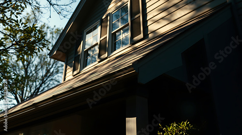 Dream House Exterior: Sunlight on Residential Home with Lush Green Trees. Beautiful Home Design and Architecture. Real Estate Photography