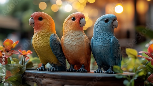 Three colorful parrot figurines on wooden stand.