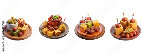 Set de tapas españolas en 3D: Platos pequeños de aceitunas, chorizo y aperitivos tradicionales