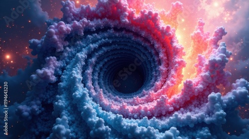 A swirling vortex of vibrant cosmic clouds, a mesmerizing celestial spectacle with a dark center, evokes a sense of wonder and the infinite possibilities of the universe.