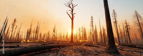 A burned forest landscape at sunset, showcasing charred trees and a dramatic sky, highlighting the aftermath of a wildfire.