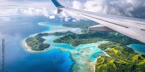 Aerial view of tropical islands with turquoise waters seen from a plane wing perspective