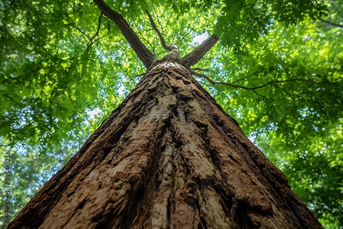 Majestic Tree Trunk Reaching Skyward Through Lush Green Canopy