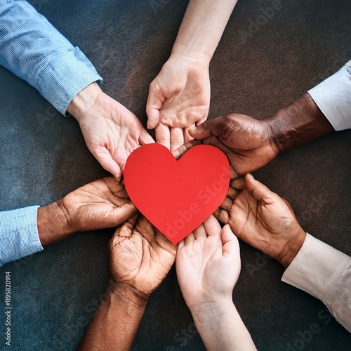 Vue de dessus de personnes multiethniques tenant des mains en forme de cœur en papier rouge. Groupe de personnes debout en cercle, promouvant l'unité, l'amour et le soutien