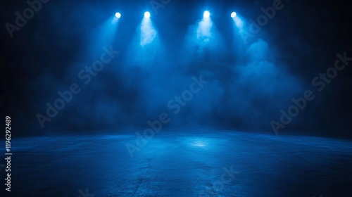 The dark stage shows, empty dark blue scene background, neon light, and spotlights The asphalt floor and studio room with smoke float up the interior texture for display products.