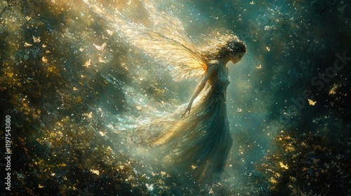 Fairytale ethereal woman with golden wings surrounded by sparkling butterflies in enchanted forest.