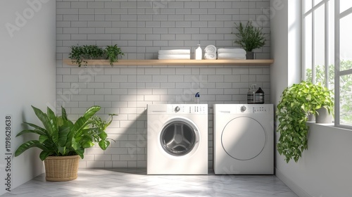 Modern laundry room, washer dryer, plants, sunlight, interior design