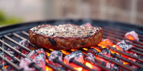 A perfectly cooked steak resting on a BBQ grill with hot coals radiating warmth and light, outdoor cooking equipment, food preparation methods