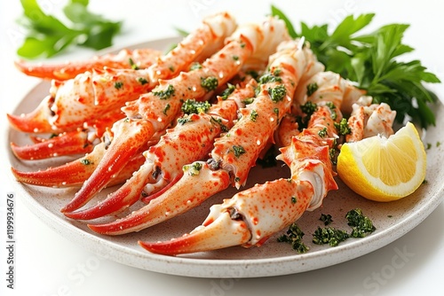 Freshly prepared crab legs garnished with herbs and lemon on a white plate