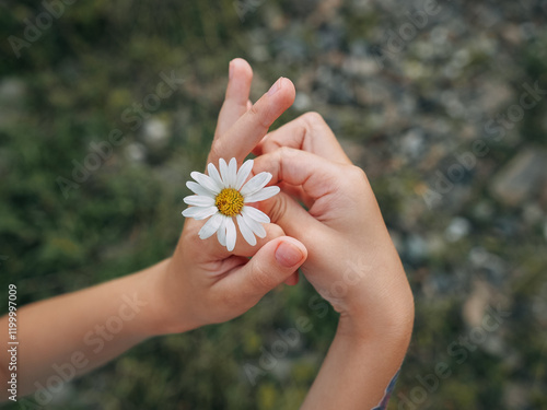 A white chamomile flower in the hands of a small child. Macro