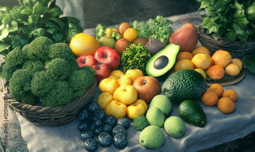 Assorted fresh fruits and vegetables on table. A mixture of fruits and vegetables including broccoli and avocado arranged neatly on a cloth. Healthy food
