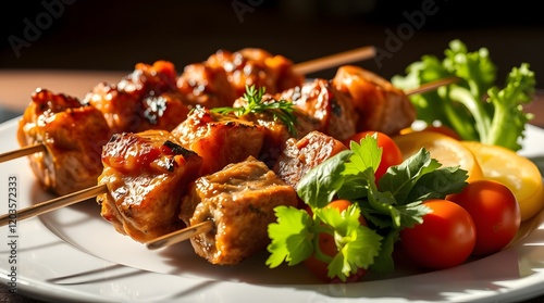 Kebabs and vegetables served on a plate, featuring vibrant colors and textures. Ideal for illustrating food, grilling, or summer meal themes. Highlights marinated meat chunks with fresh.