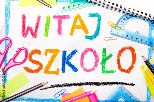 Kolorowy rysunek z napisem WITAJ SZKOŁO otoczony przyborami szkolnymi