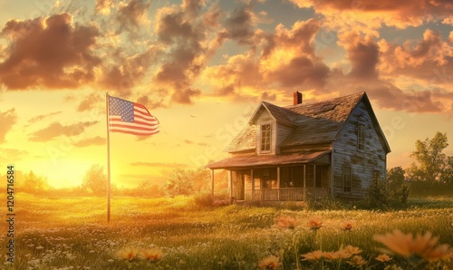 Rustic Farmhouse Sunset American Flag Rural Scene (1)