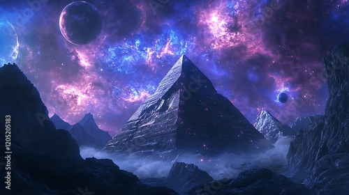 A magical great pyramid reflecting cosmic light under a fantasy sky with ethereal planets and luminous nebulae