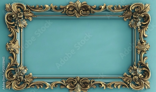 Decorative Picture frame golden round carvings with teal tone background , showcasing intricate floral detailing, suitable for premium artwork, invitation, or classical design