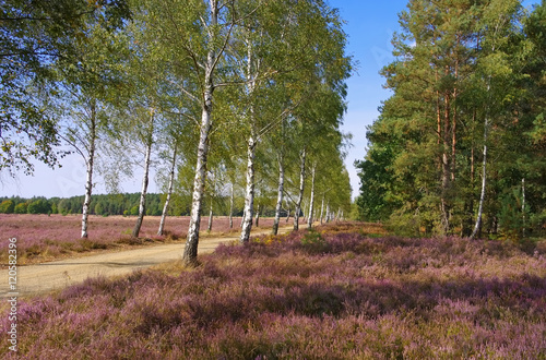 Heidelandschaft im Spätsommer mit Wanderweg - Heath landscape with flowering Heather and path