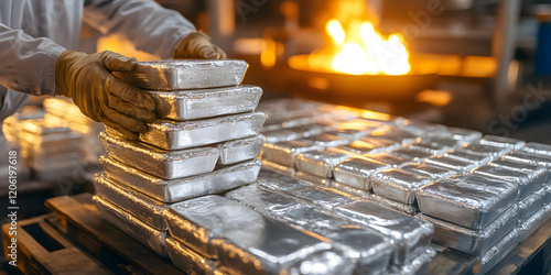 Worker handling stacks of shiny metal ingots in a factory setting. A fiery furnace glows in the background.