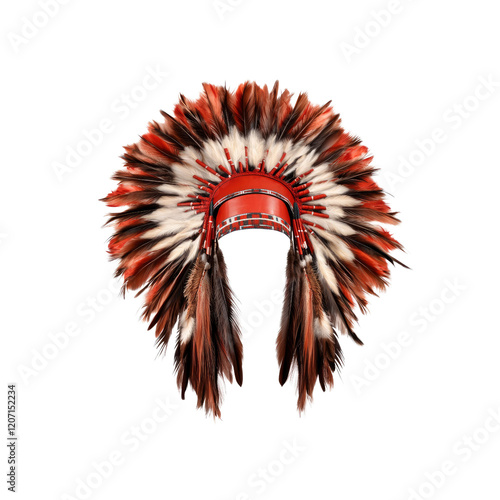 Native American Headdress, Traditional War Bonnet, Red and Brown Feathers, Isolated on Black