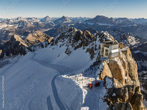 Aerial View Of Marmolada Glacier From Drone, Dolomite Mountains. Sella Ronda group and the Marmolada group in winter. Marmolada in winter, Dolomites and Tauern range in background, Dolomites, Italy.