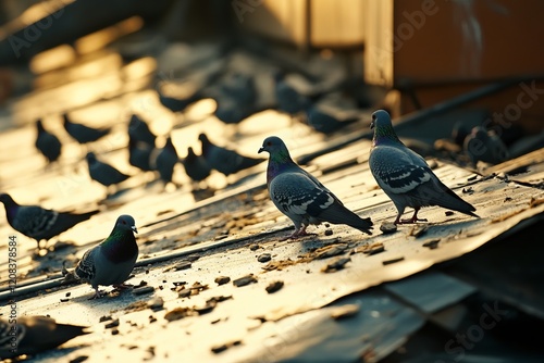 Pigeons perched on urban surfaces, depicting city wildlife and potential pest issues
