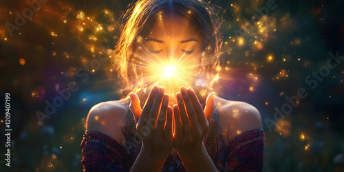 Shaman astrology ritual, psychology freedom enjoy mystic mind power, fun live joy concept Spiritual head portrait, woman praying outdoors, good nature sunrise fresh sunset air, astrology soul closeup.