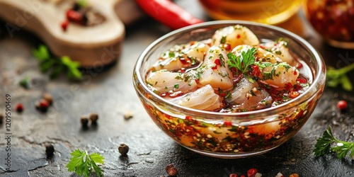 Closeup of a glass bowl filled with vibrant fish marinade featuring herbs and spices against a dark textured background with scattered peppercorns and herbs.