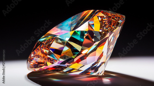 A minimalist image of a diamond placed on a neutral solid background. The facets of the diamond are crisp and highly detailed, reflecting light beautifully to showcase its brilliance and clarity