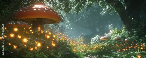 A fantastical forest filled with giant mushrooms and luminous flowers.